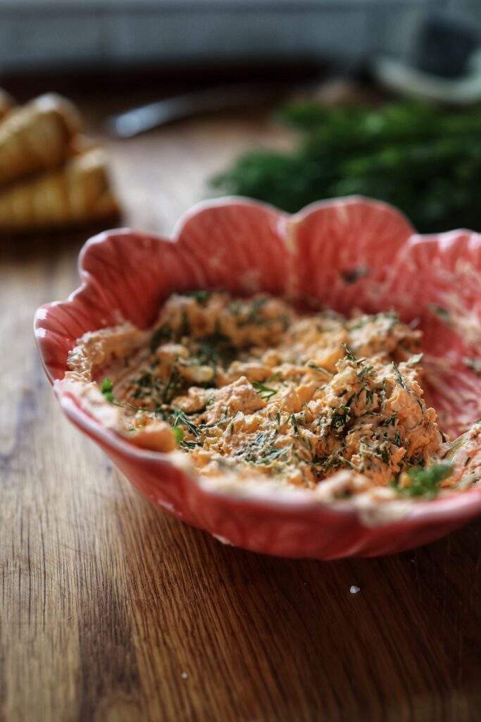 5. Pregatiti crema mixand impreuna crema de branza pufoasa cu somon, telemeaua rasa sau sfaramata, verdeturile tocate.