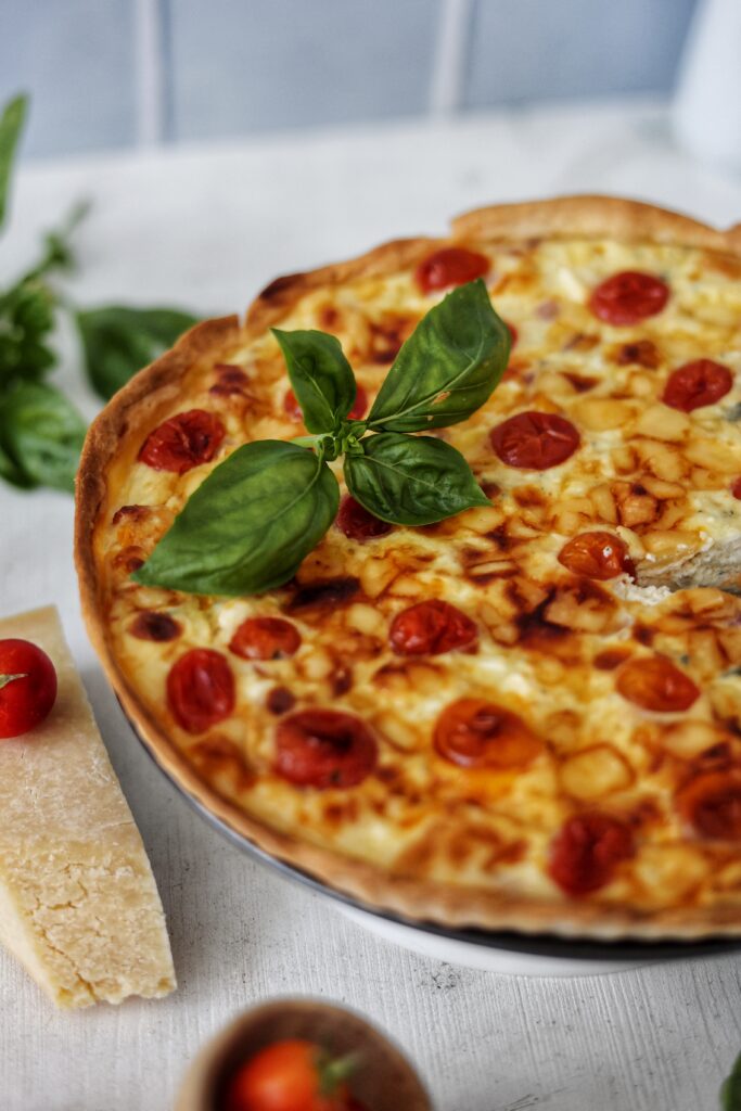 - Dupa ce crusta s-a copt partial, umpleti cu amestecul de oua si branza, iar la suprafata asezati rosiile cherry. Coaceti pentru inca 30 de minute la 180C sau pana cand umplutura devine ferma si are o crusta aurie.