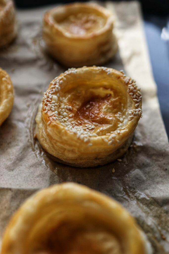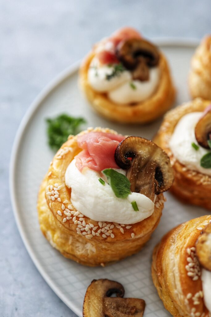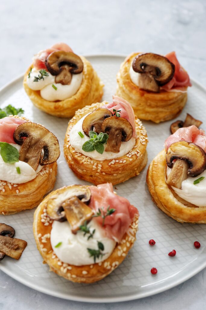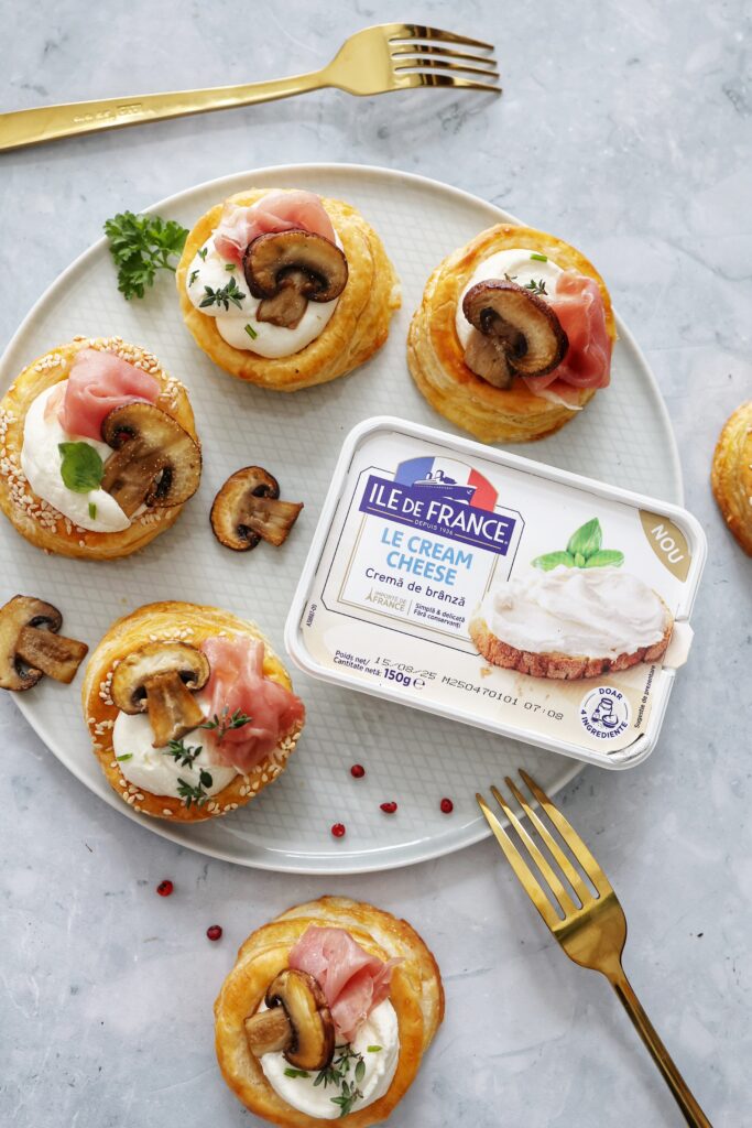 Foietajul creste la cuptor si se umfla ca niste pernute aurii, iar la interior raman goale – perfecte pentru umplut. Eu le-am combinat cu ciuperci rumenite, crema fina de branza si prosciutto usor sarat. Simplu, dar cu gust si eleganta.