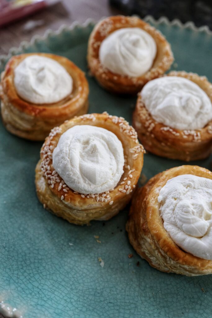 Daca le umpleti prea devreme, foietajul se inmoaie – asa ca montati-le fix inainte de servire.
